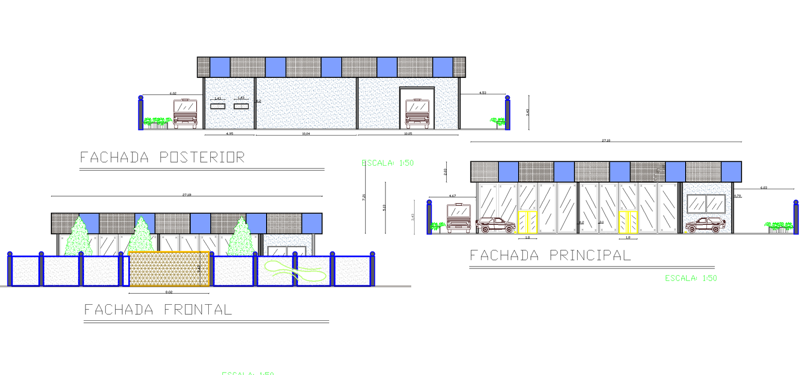 Commercial plan. Detailing main facade, side facade, front facade detailing. Detailing of doors, windows, railing, dimension detailing, etc.,