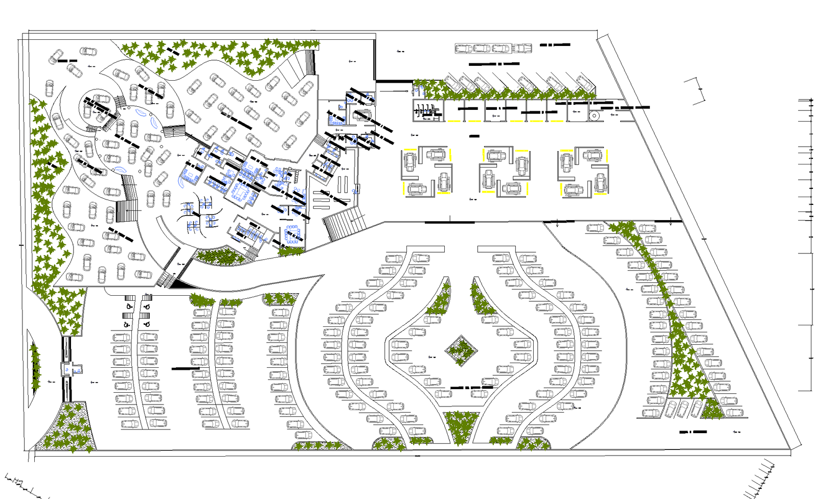 Plan for auto-mobile dealership store. Bird –eye view plan with a detailing of a service station, car parking area, office space, etc.,