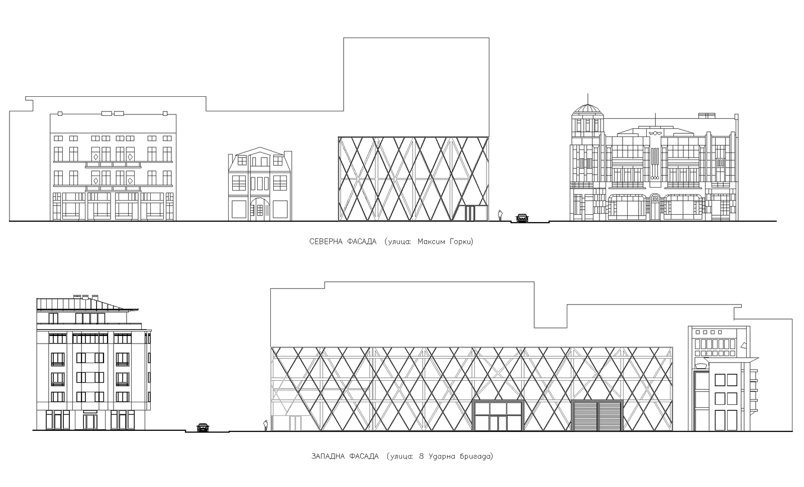 Elevation of a commercial plan. The front and back elevations with dimension detailing.