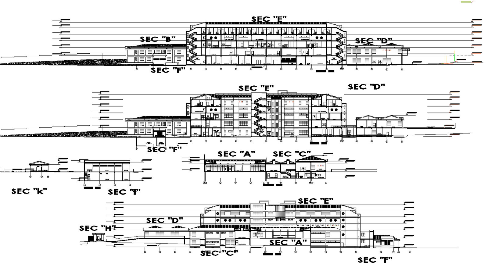 Elevation of a general hospital. The front and back elevations with dimension detailing.