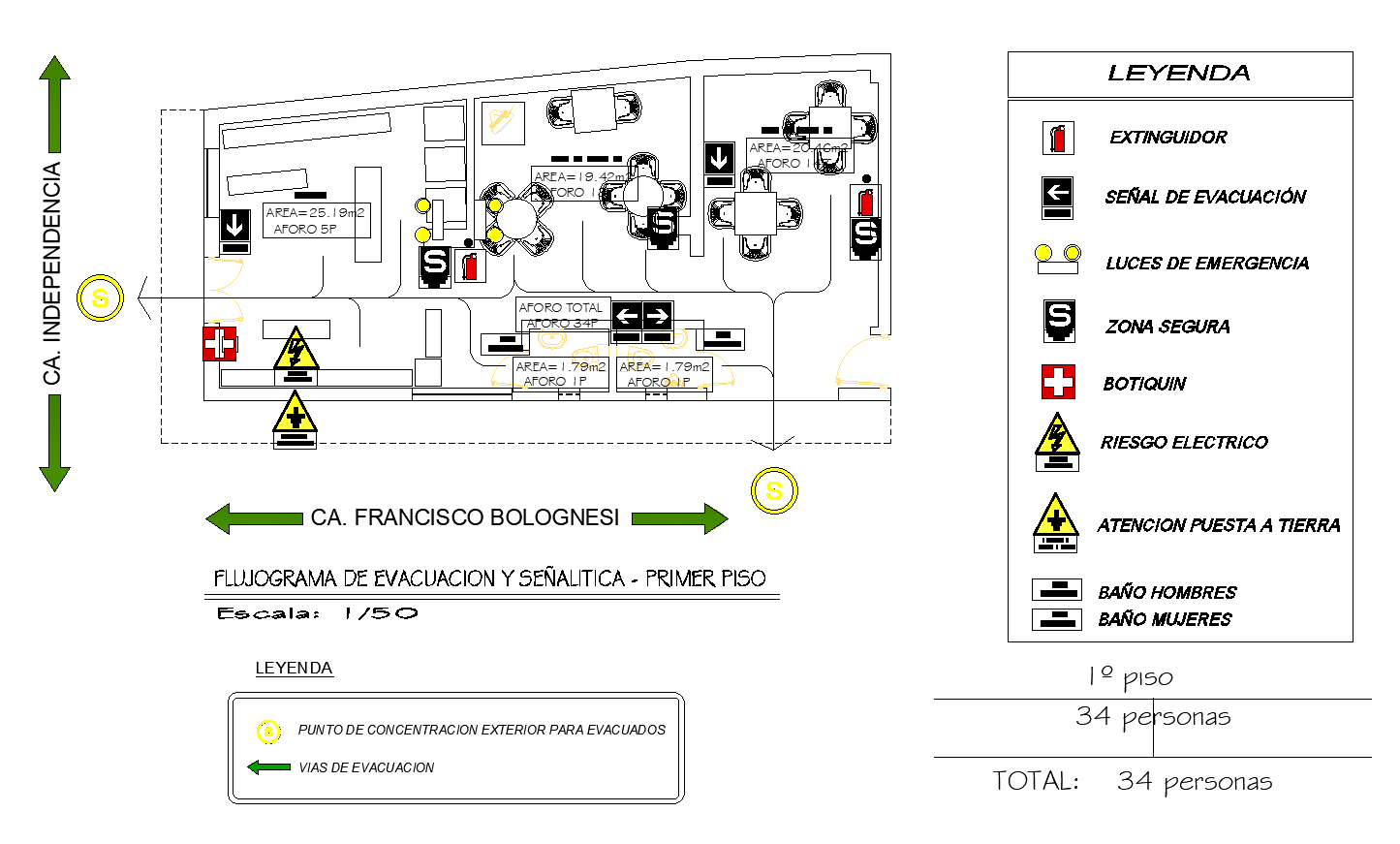Store plan. The layout of a store with furnished detailing. Detailing of furniture, extinguisher, evacuation signal, emergency light, safe zone, first aid, etc.,