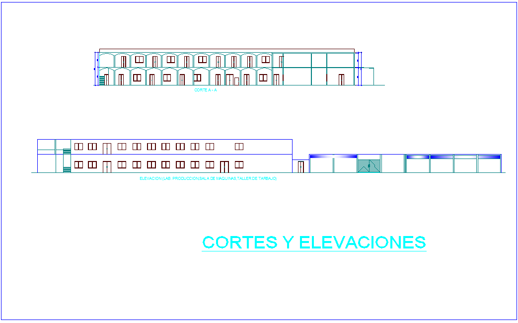 Different elevation and section view of technical collage dwg file in elevation with floor and wall view,wall support view,floor position view,view of area of machine workshop and lab of production and section view with floor and floor level view.