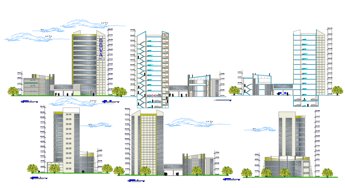 Financial Center dwg file. layout plan of a Building with various floors, elevation design of in Financial Center AutoCAD format.