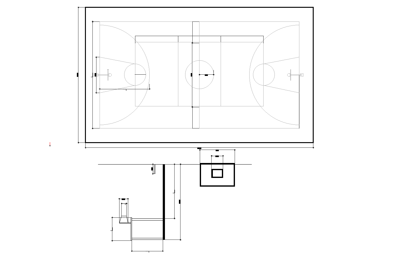 Basketball court plan. The top view plan with detailing of court and a table where two persons play with racquets and a ball.