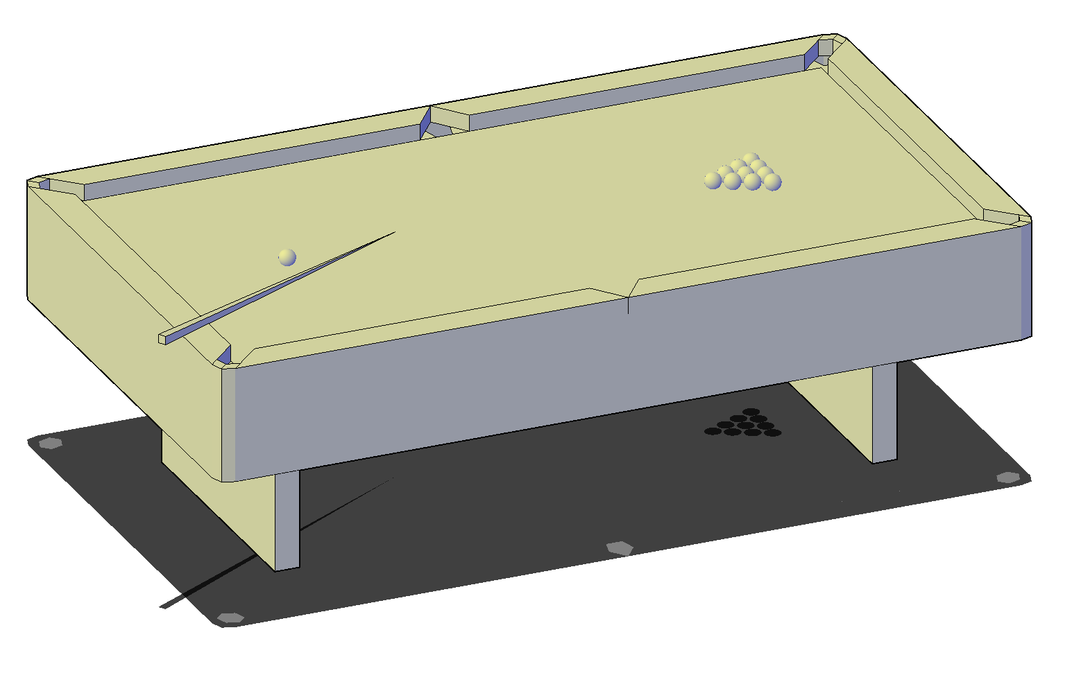 Pool table plan. 3D plan with detailing of a structure with balls, slender stick.