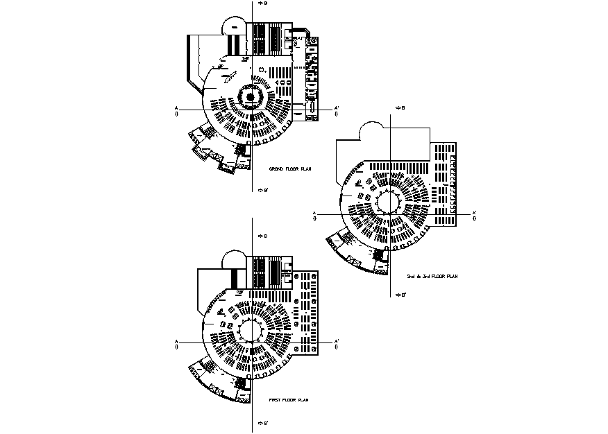 Scientific center plan detail dwg file, with section line detail, dimension detail, naming detail, round shape building detail, ground floor to 3rd floor detail, etc.