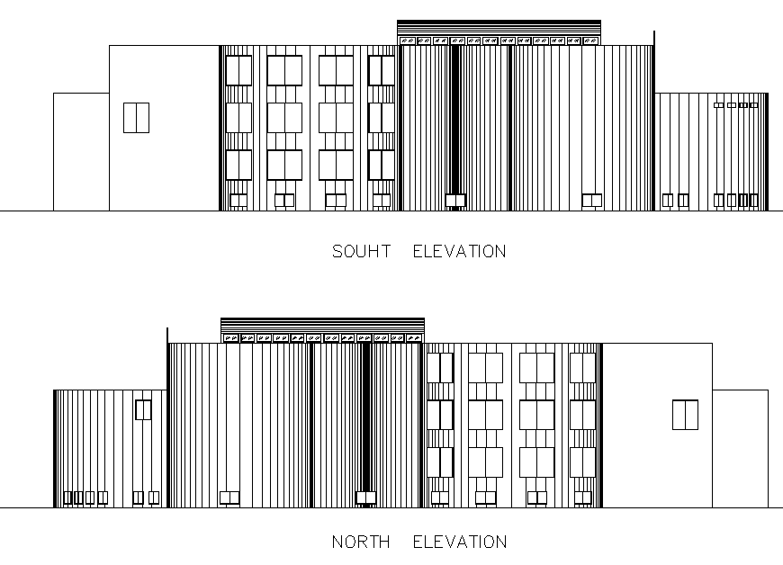 North elevation and south elevation plan detail dwg file, with parapet wall detail, furniture detail in door and window detail, etc.