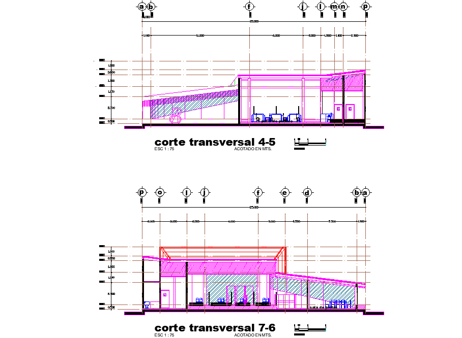 Detail of bank plan dwg file, including section 4-5 detail, section 7-6 detail, furniture detail in door and window detail, etc.