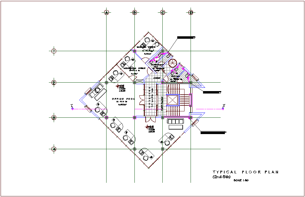 Single water line view with architectural second to fifth floor plan for mixed use building dwg file in plan with view of office area and manager room,washing area with view of single water line view and floor level with second to fifth floor plan.