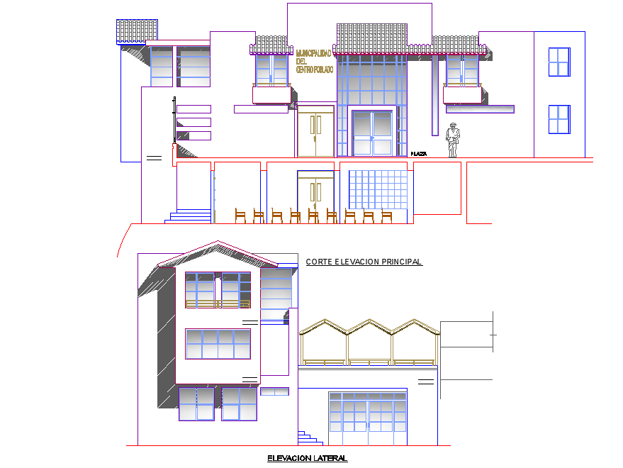 Elevation and section house detail dwg file, with front elevation detail, section plan detail, furniture detail in table, chair, door and window detail, etc.