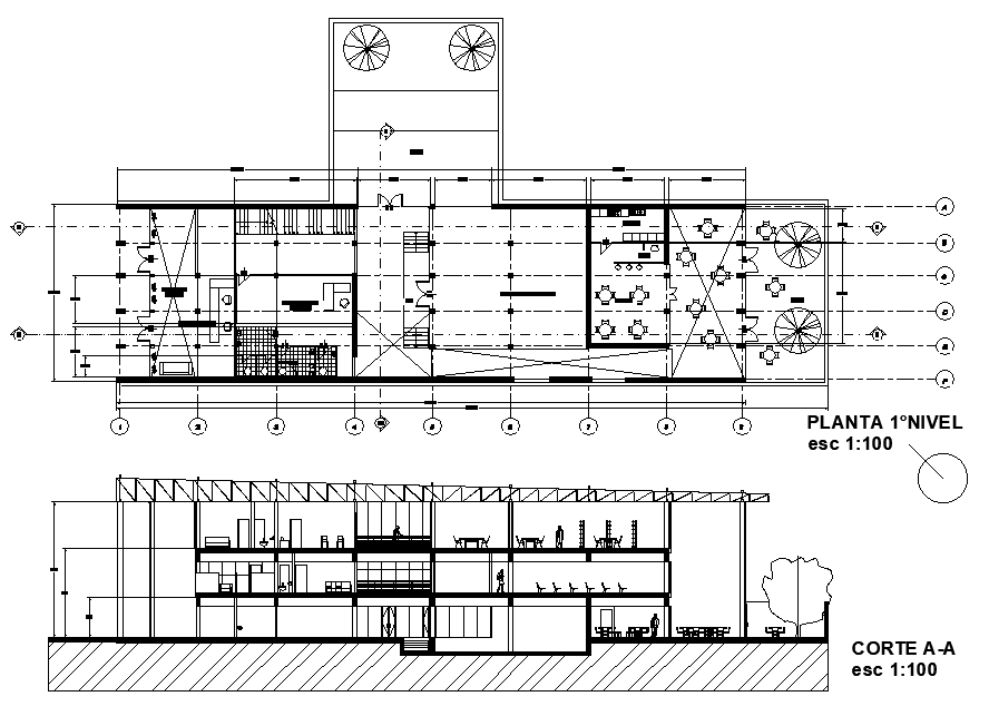 Plan and section detail dwg file, including north direction detail, section line detail, centre line detail, dimension detail, etc.