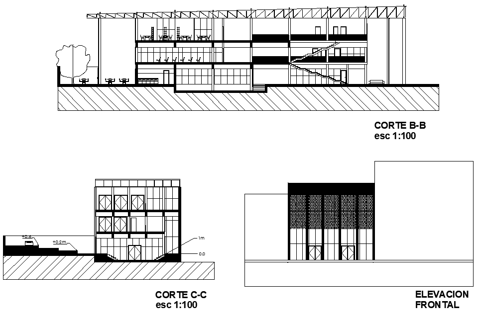 Elevation and Section office plan detail dwg file, with section B-B’ detail, section C-C’ detail, front elevation detail, scale 1:100 detail, etc.