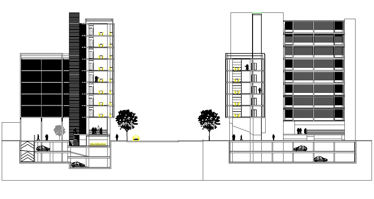 Section commercial building plan detail dwg file, with basement level detail, landscaping detail in tree and plant detail, furniture detail in door and window detail, etc.