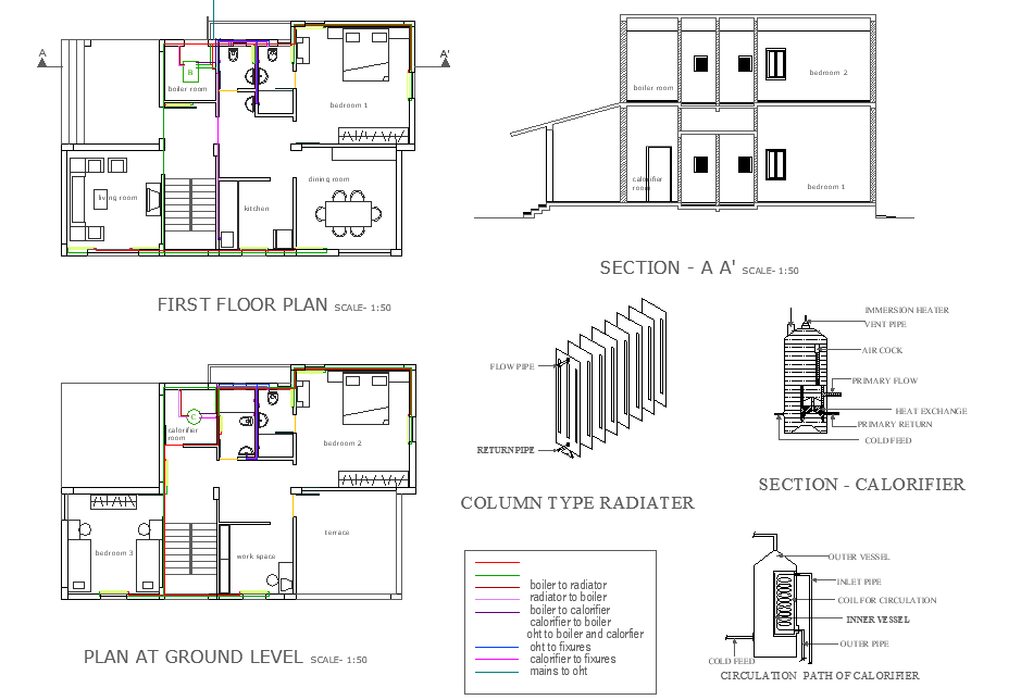 Column type radiater detail, circulation path of calorifier, ground floor to first floor plan detail, section A-A’ detail, section line detail, etc.