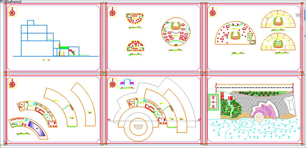 This curved architectural layout provides a complete set of circular, semi-circular, and radial design concepts ideal for organic and conceptual architecture. The drawing includes rounded room arrangements, curved seating areas, and arc-shaped partitions that create smooth interior circulation and balanced visual symmetry. Multiple radial plans show precise zoning within concentric layers, allowing designers to understand spatial hierarchy and functional distribution within curved structures. The master radial plan highlights three interconnected circular bands that support the development of pavilions, cultural halls, landscape nodes, or community spaces. A detailed multi-level block elevation at the top of the sheet adds clarity to height transitions, stepped massing, and ground access, helping users visualize vertical architectural composition.