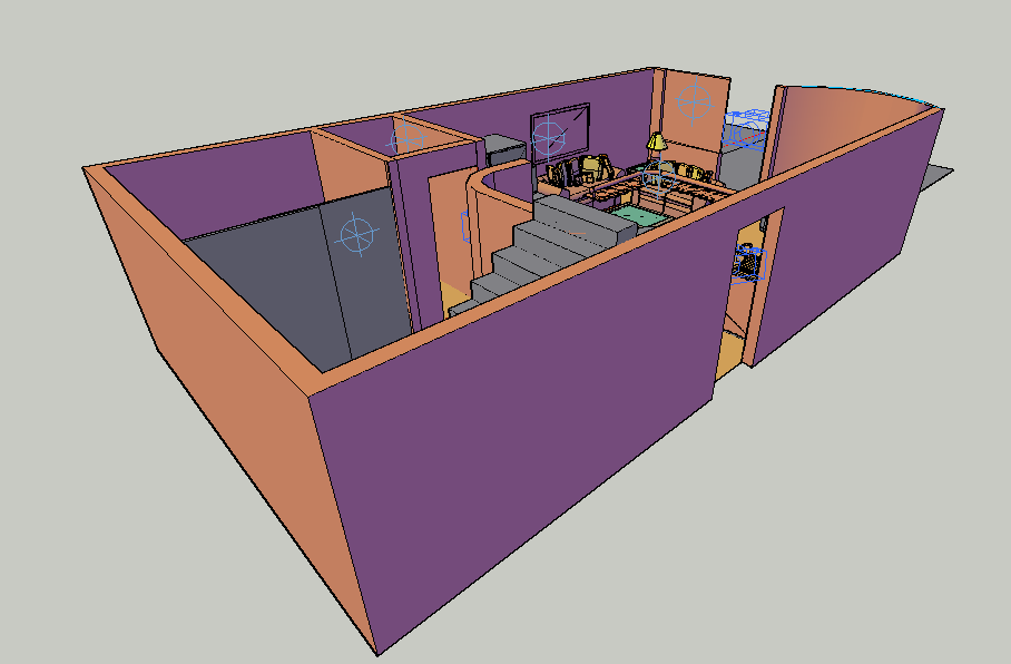 Camera position with its preview for 3d view of interior of house dwg file in 3d view with camera position view with its position view and wall distribution view with room and interior view of house with designer door view,sofa set,table lamp view,stair view.