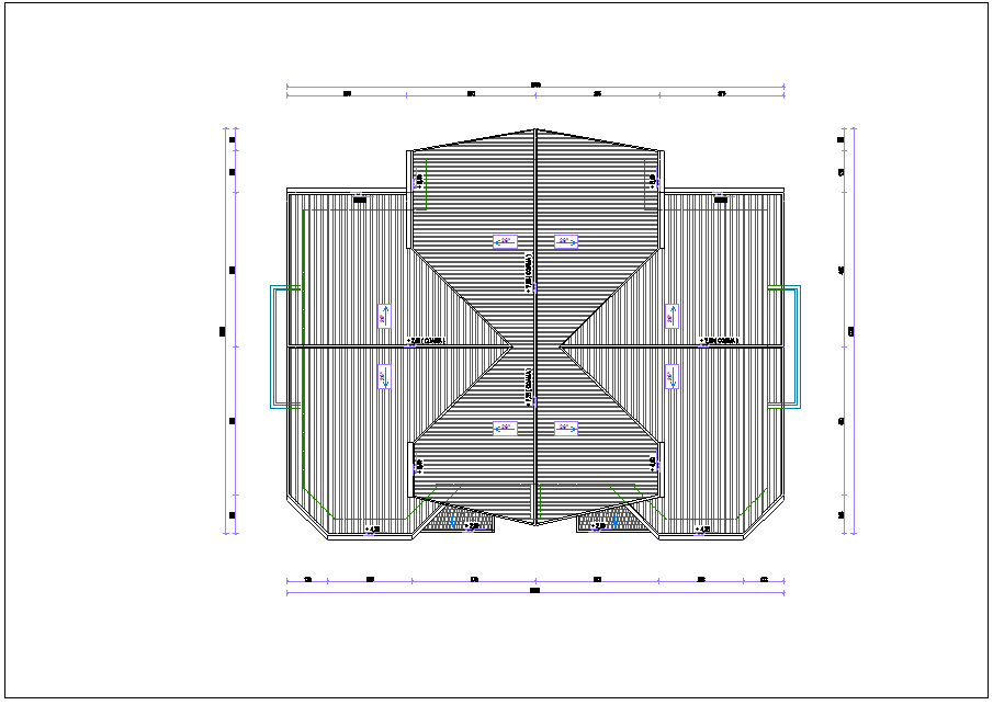 Roof plan of duplex with architectural view dwg file in plan with distribution of area and view f roof area with its texture view and tile view of roof,angle view of roof area level of height with necessary dimension in plan.