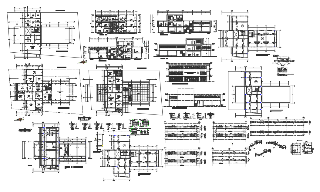Administrative building find construction plan, structure plan, section plan, foundation plan and beam detail, a layout plan in AutoCAD format.