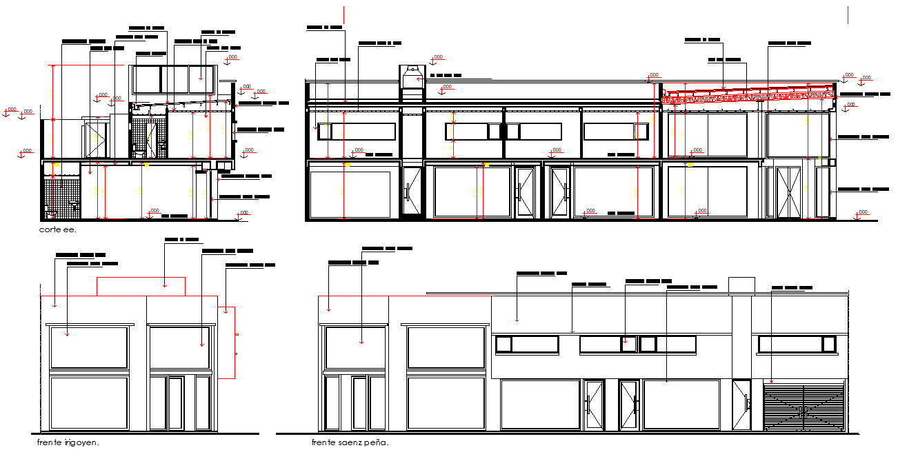 Elevation and section office plan detail, levelling detail, dimension detail, naming detail, furniture detail in door and window detail, etc.