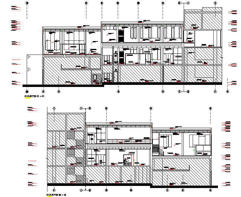 Detail of section plan dwg file, with section C-C’ detail, section D-D’ detail, centre line plan detail, levelling detail, etc.