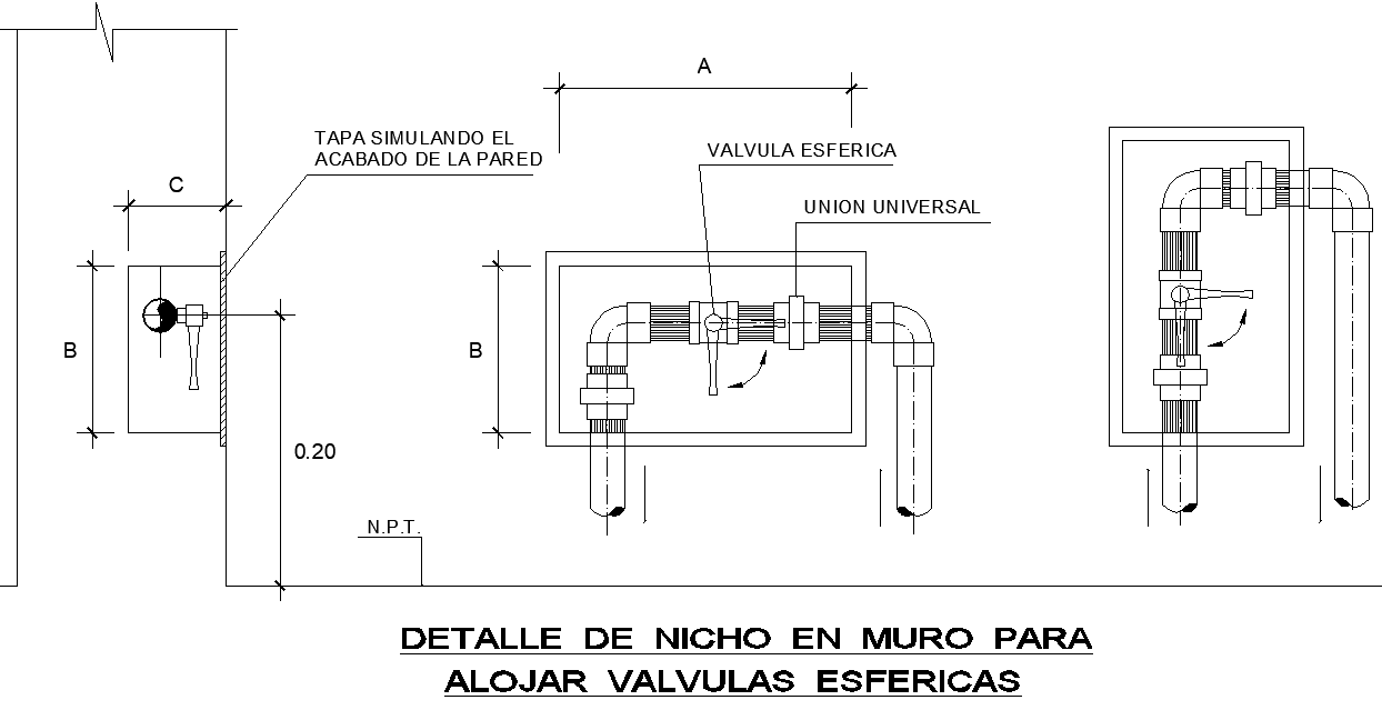 Detail in wall to accommodate spherical valves plan, dimension detail, naming detail, levelling detail, etc.