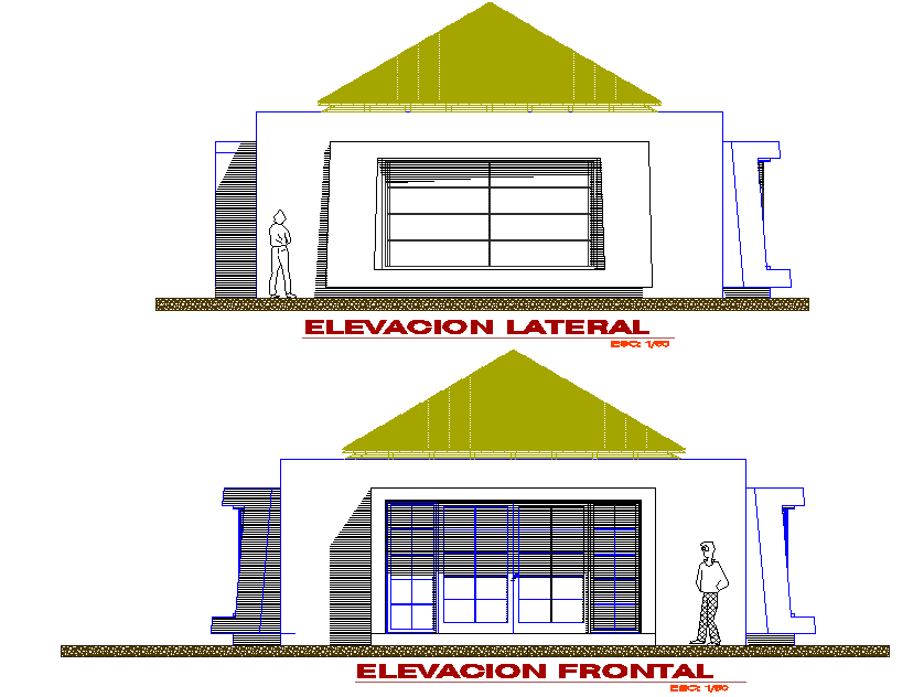 Elevation Administration plan detail, with front elevation detail, side elevation detail, scale 1:50 detail, door and window detail, etc.