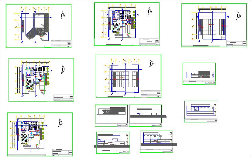 The architectural sheets also display multiple sectional views and elevation drawings, showing façade alignment, height proportions, kitchen exhaust placement, service openings, and building massing. The plan highlights proper ventilation zones, structural bays, window positioning, and spatial connections between indoor dining and utility areas. Separate planning sheets illustrate ground floor dining, upper-level seating layouts, and exterior structure views for better interpretation of the complete restaurant building design. This drawing is ideal for architects, interior designers, civil engineers, and builders involved in commercial restaurant projects, food outlets, dining spaces, and hospitality design where accurate architecture planning and service flow arrangement are essential.