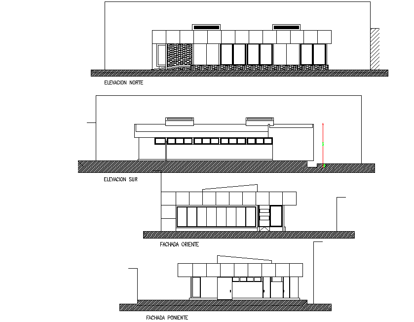 Elevation office plan detail dwg file, with front elevation detail, right elevation detail, left elevation detail, back elevation detail, etc.