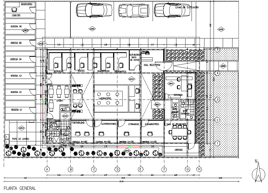 General office plan detail, north direction detail, landsceping detail in tree and plant detail, cut out detail, centre line plan detail, etc.