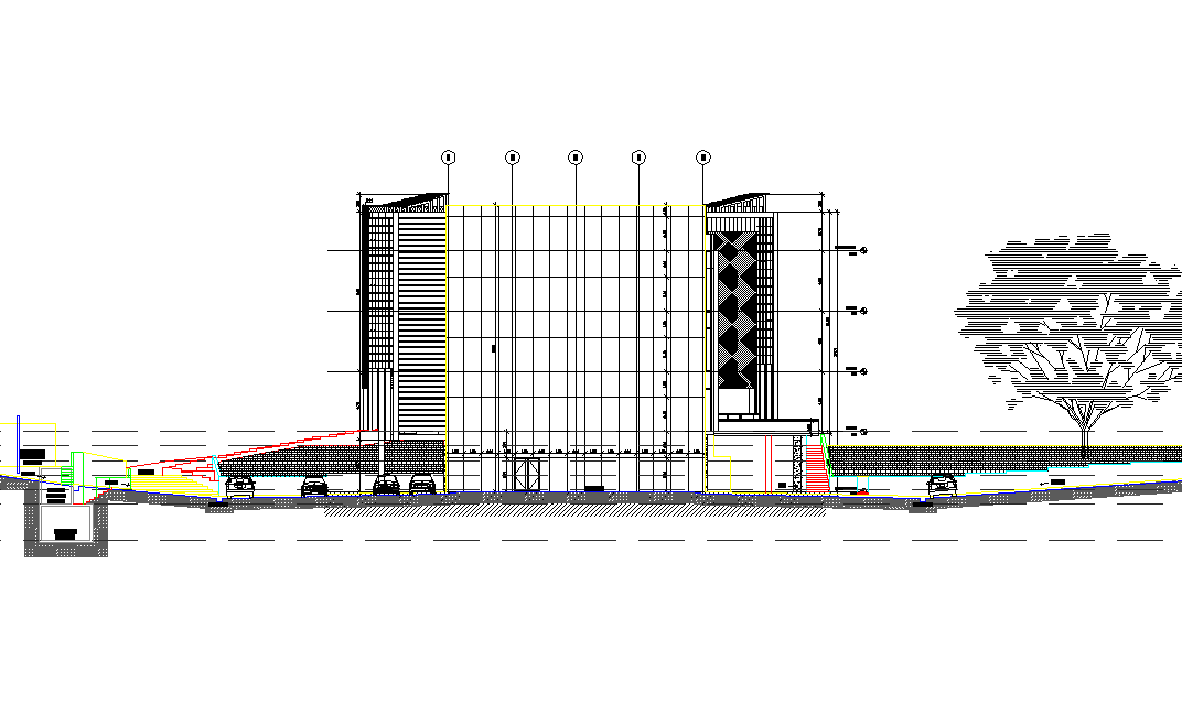 Front elevation plan detail, with landsceping detail in tree detail, car parking detail, stair detail, centre lien plan detail, etc.