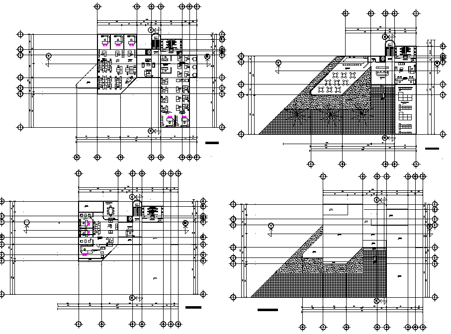 Edificiode oficinas plan, ground floor to tarrece floor detail, section line detail, futniture detail in table, chair, sofa, door and window detail, centre line plan detail, dimension detail, etc.
