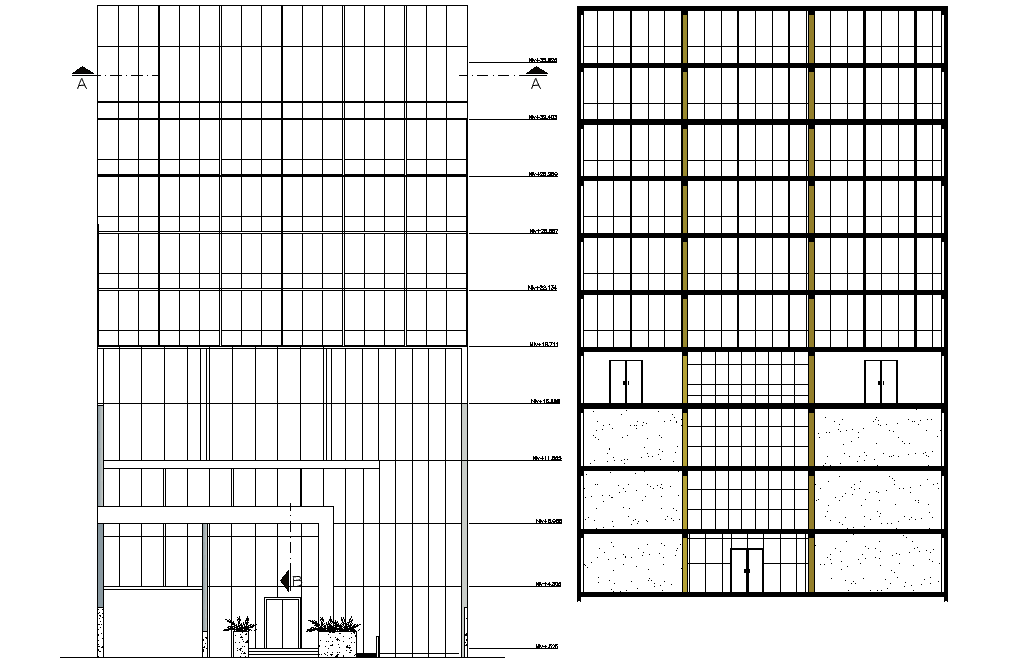 High rise building elevation detail, front elevation detail, side elevation detail, landsceping detail in plant detail, etc.