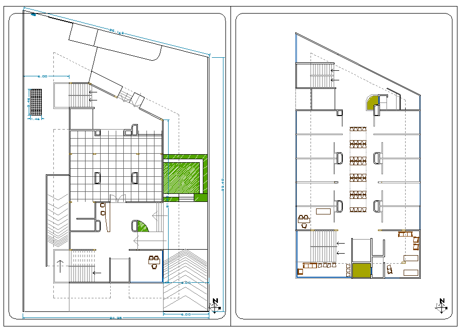 Building office plan detail, ground floor and first floor plan detail, ramp detail, stair detail, dimension detail, etc.