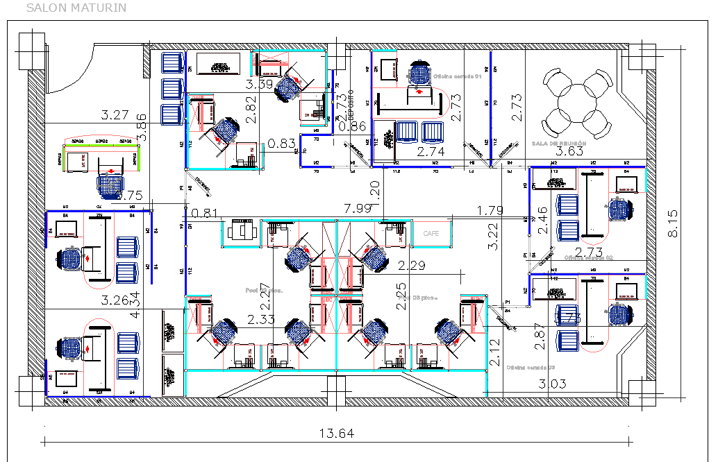 Salon plan detail, furniture detail in chair, table, door and window detail, mirror detail, dimension detail, etc.