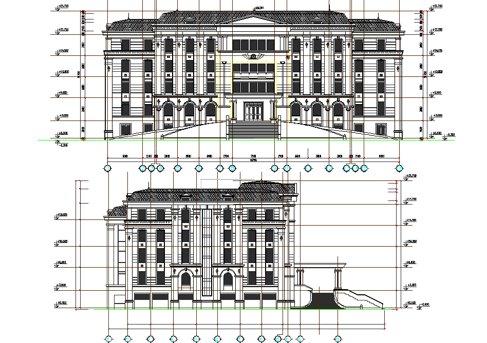 Elevation hotel detail dwg file, with front elevation detail, side elevation detail, leveling detail, diemnsion detail, centre lien detail, etc.