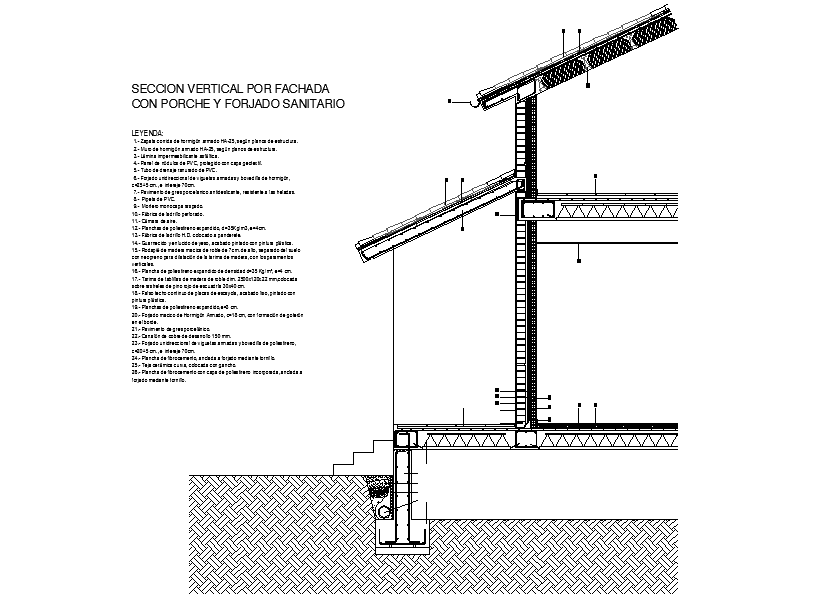 Front porch vertical section dwg file, Sectional details with text detailing, sectional details with measurement and text is shown