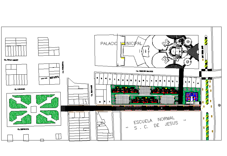 Commercial building plan detail, landscaping detail in tree and plant detail, block number detail, stair detail, etc.