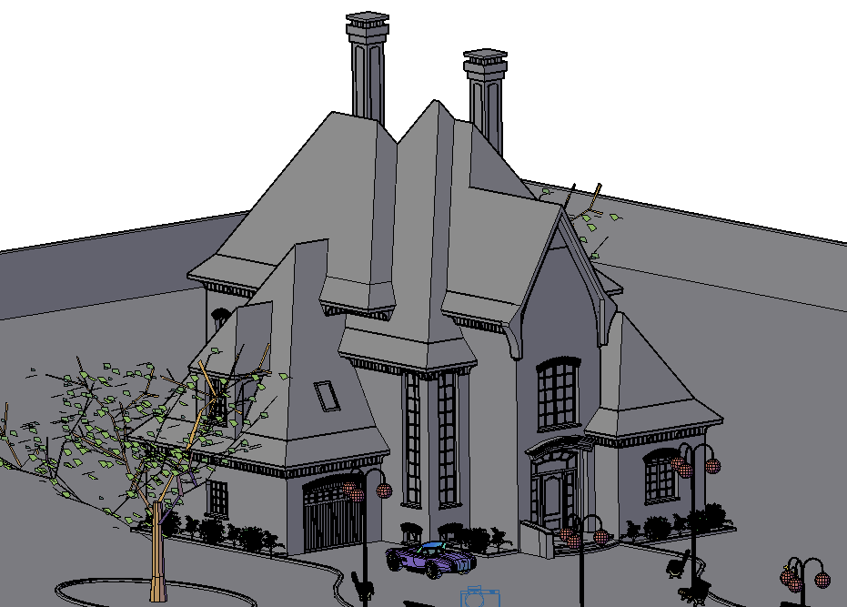 House 3 D plan detail, chimney detail, street light detail, car parking detail, landscaping detail in tree and plant detail, door and window detail, etc.