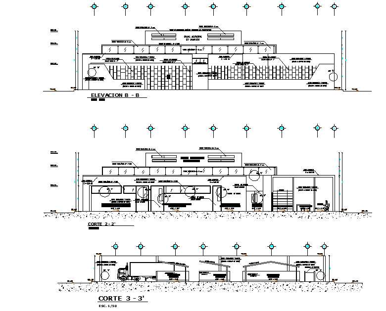 Detail in house plan, elevation B-B’ detail, section 2-2’ detail, section 3-3’ detail, naming detail, dimension detail, etc.