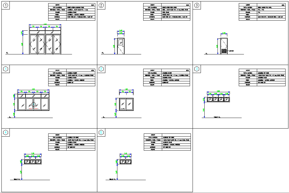 Door and window detail, glass detail, naming detail, dimension detail, specification detail, elevation detail, etc.