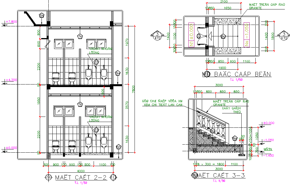 Toilet detail and hand reeling detail, stair plan detail, leveling detail, dimesion detail, section line detail, scale 1:50 detail, vent detail, naming detail, etc.