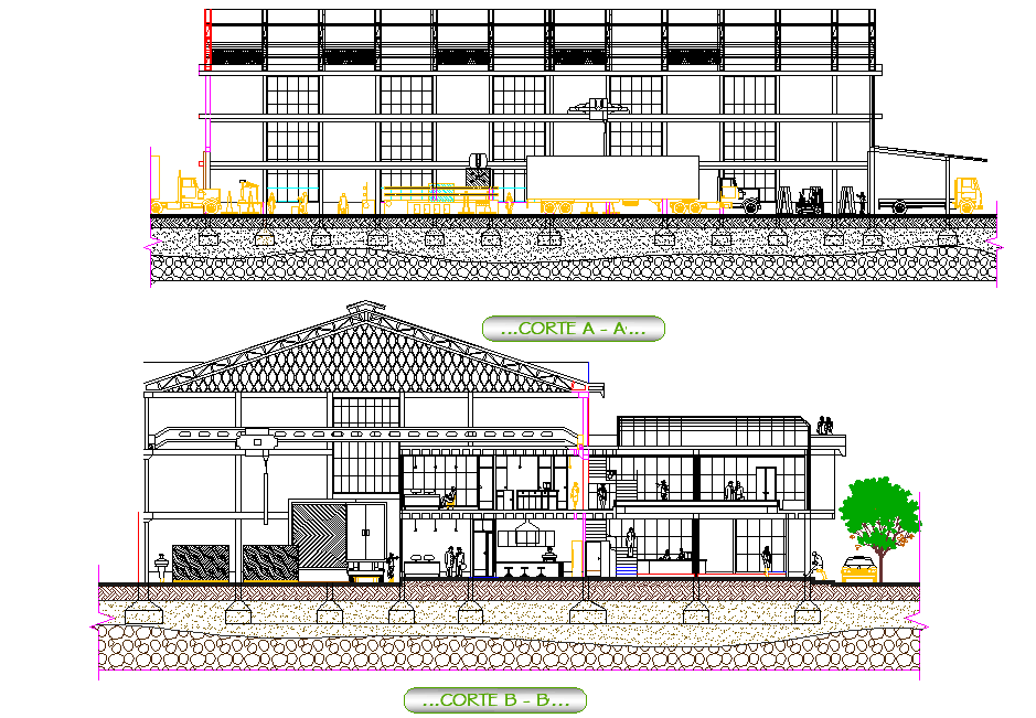 Section tempered glass factory plan detail, section A-A’ detail, section B-B’ detail, landscaping detail in tree detail, car parking detail, stair detail, foundation detail, furniture detail in table, chair, door and window detail, etc.
