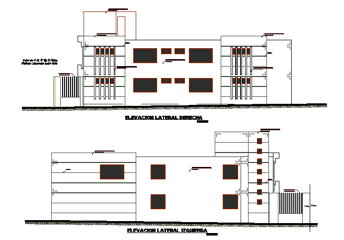 Elevation design of a building, Front elevation and section detail dwg file, front elevation of a building is shown, sectional details, staircase view