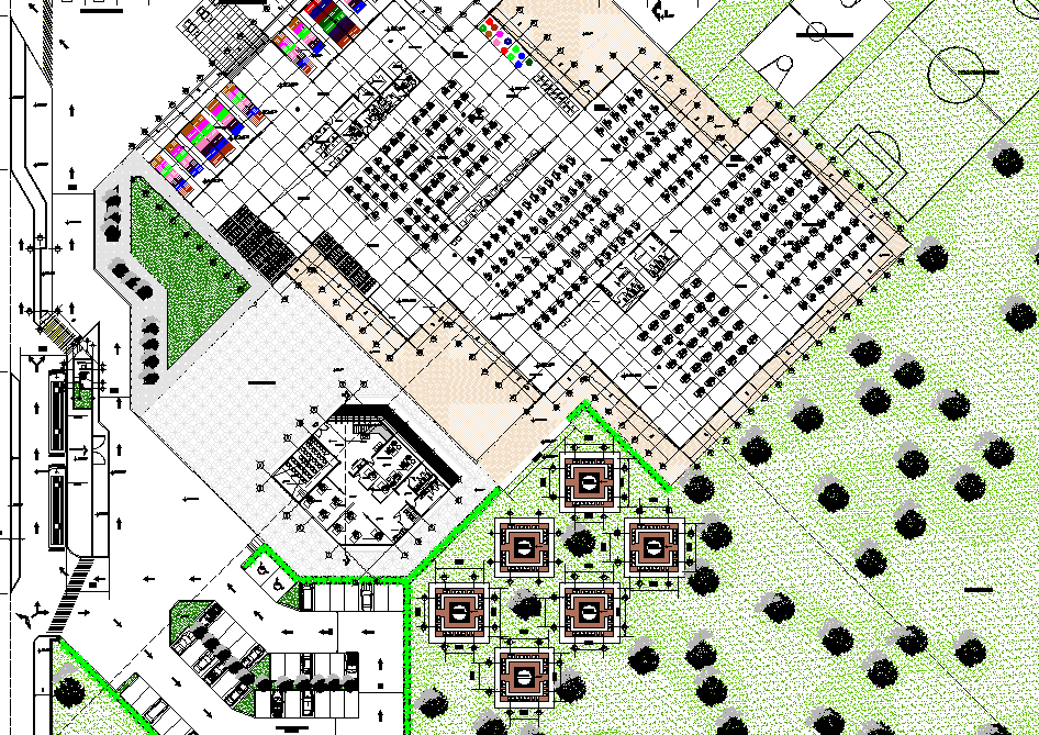 Textile factory plan detail, landsceping detail in tree and plant detail, north direction detail, centre line plan detail, etc.
