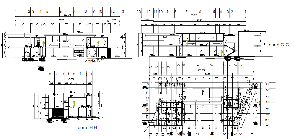Front elevation of a building dwg file, complete details are shown with text detailing in auto cad format