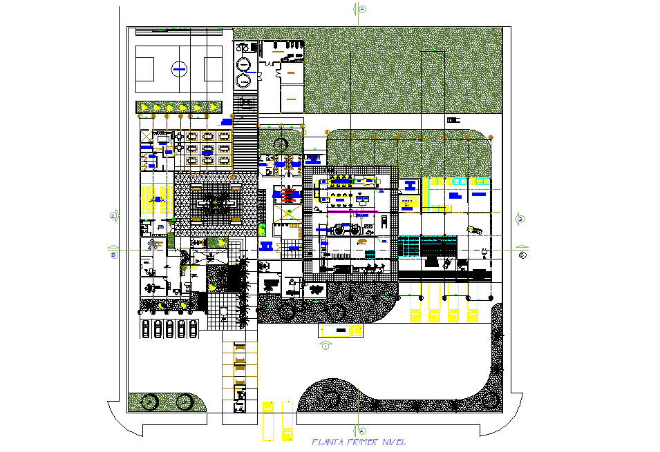 Food processing plant floor plan detail, section line detail, truck and car parking detail, landscaping detail in tree and plant detail, cut out detail, centre line detail, etc.