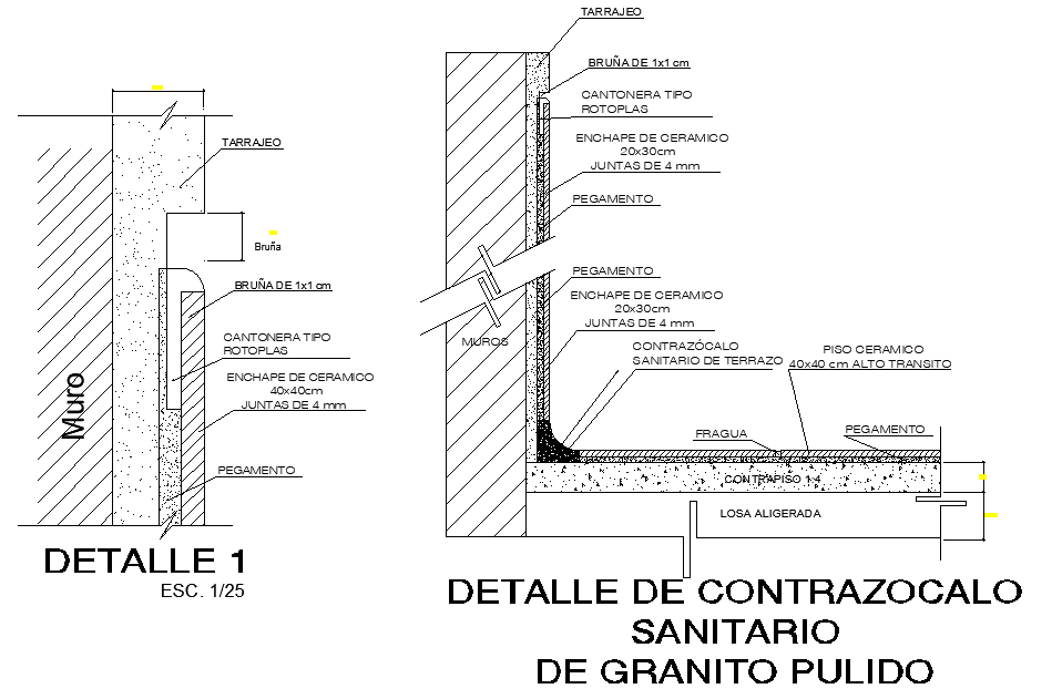 Polished granite sanitary countertop detail, section detail, scale 1:25 detail, naming detail, dimension detail, etc.