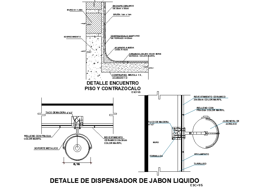 Sink section detail, dimension detail, naming detail, scale 1:15 detail, concrete mortar detail, etc.