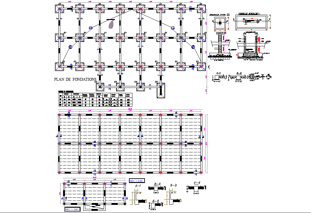 Foundation plan and section detail, reinforcement detail, dimension detail, naming detail, table specification detail, etc.