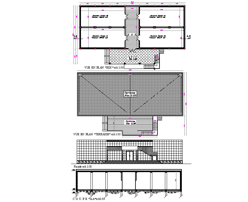 Plan, elevation and section house detail, dimension detail, naming detail, stair detail, section line detail, etc.